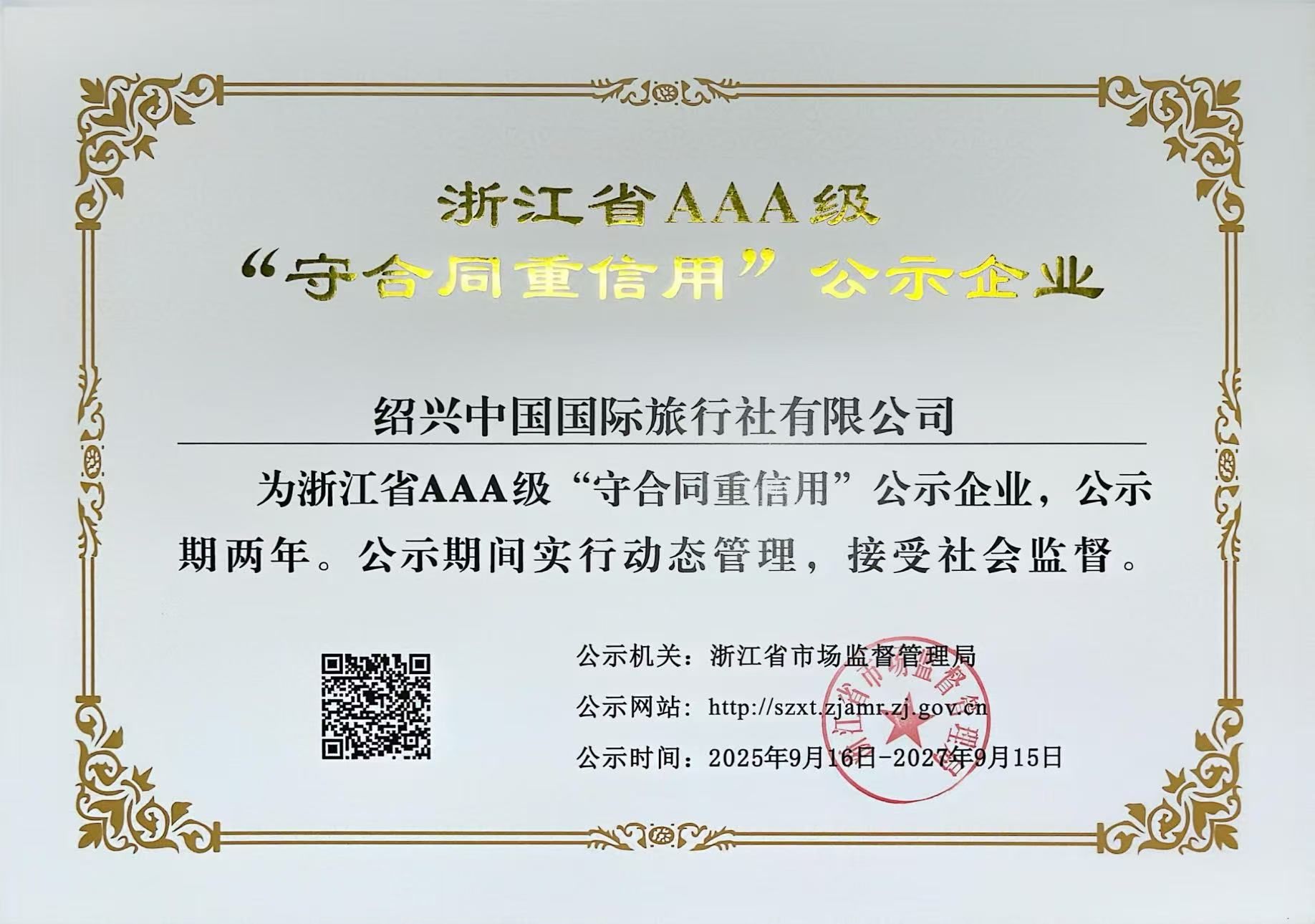 绍兴国旅在2009年被评为“浙江省首批四星级品质旅行社”。绍兴国旅多次被浙江省旅游局评为“浙江省百强旅行社”,绍兴国旅被绍兴市人民政府评为“绍兴市服务业龙头企业突出贡献奖”;被越城区消费者权益保护委员会命名为“绍兴市越城区消费者信得过单位”;被绍兴市人力资源和社会保障局评为“劳动保障诚信示范企业”;被浙江省市场监督局评为“浙江省AAA级守合同重信用公示企业”。绍兴国旅还多次荣获“绍兴市旅行社优质服务奖”、“绍兴市优秀旅游企业”、“绍兴市最佳旅行社”“绍兴市十佳旅行社”、“绍兴旅行社二十强”、“旅行社行业推广奖”等荣誉称号;公司拥有一支优秀的导游员队伍,公司导游员曾荣获“绍兴市最佳导游员”、“绍兴市十佳(金牌)导游员”、“导游最佳讲解奖”、“绍兴市优秀导游”。浙江省文化旅游厅举办的原创导游词大赛“最具潜质代言人”等荣誉称号;绍兴国旅是浙江省旅行社协会常务理事单位,公司全体员工将竭诚为国内外嘉宾提供优质满意的服务!